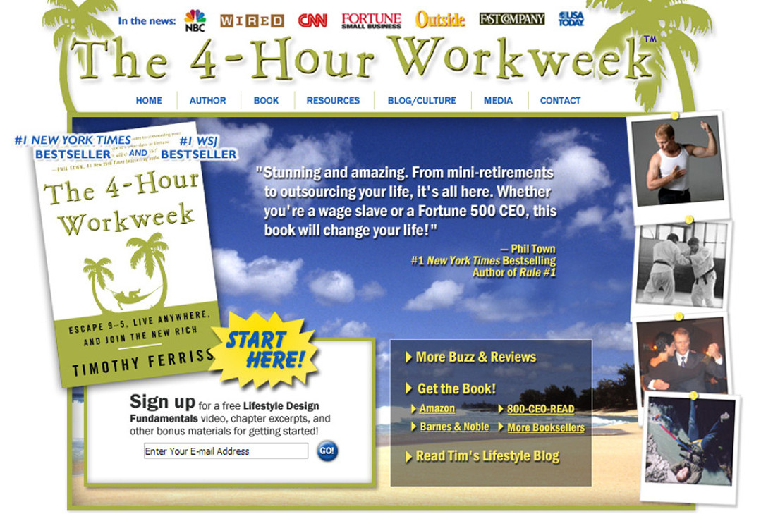 See below for a call to action example from the book The 4 Hour Work Week. The ‘START HERE’ sign is bright and stands out. Then customers are encouraged to sign up for a newsletter and in return they will receive exclusive bonus materials.